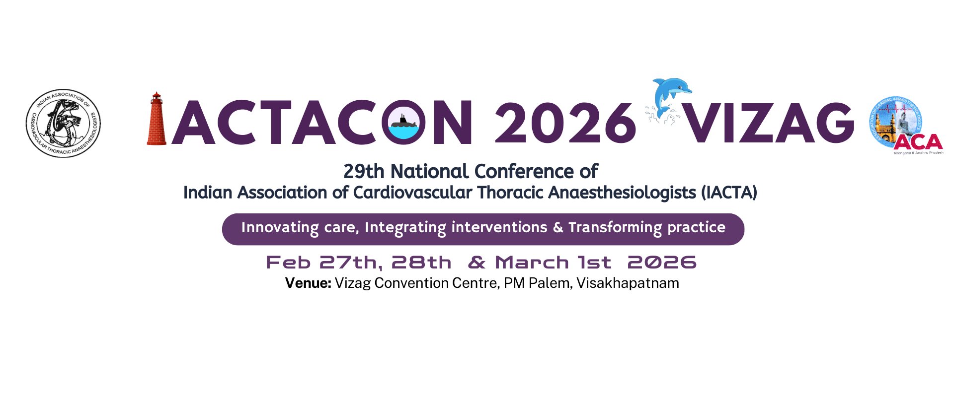 The scientific committee of the 29th annual conference of the Indian association of cardiovascular & thoracic anaesthesiologists (IACTACON2026 VISAKHAPATNAM) invites abstracts for Janak Mehta award paper presentation, free paper and e-poster presentation during the conference to be held from 27th, 28th Feb & March 1st 2026 at Vizag conventions, Visakhapatnam.